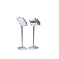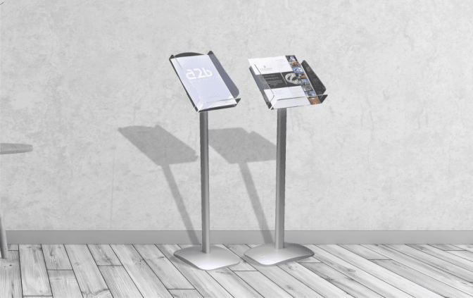 Stilfullt broschyrställ i aluminium med tung fot och broschyrfack av stark polycarbonat. Finns både med stående och liggande broschyrfack, hög kvalitet i stilren design.
