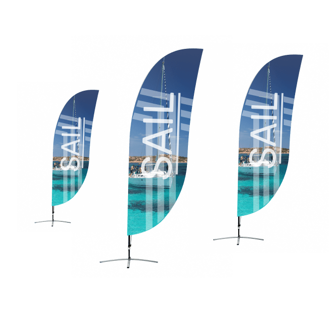 Företagets "Must have" Lätt vikt, stor och stilig exponering som tar liten plats att transportera eller att förvara. Den finns att beställa i flera former men vi har valt ut hajfena med rak nederkant som standard. I priset får du en tryckt tygflagga, mast, bärväska och en markskruv för en Beachflagga Small. För medium, large och XL är det en markskruv som tillbehör istället. Beachflagga passar perfekt utanför din butik, på stranden, golfbanan eller på andra platser främst utomhus eller på en större mässa. Du kan kombinera din beachflagga med flera markfästen för extra stabilitet, både utomhus och inomhus. Till exempel om din beachflagga ska stå utomhus rekommenderar vi en kryssfot med vattentyngd.