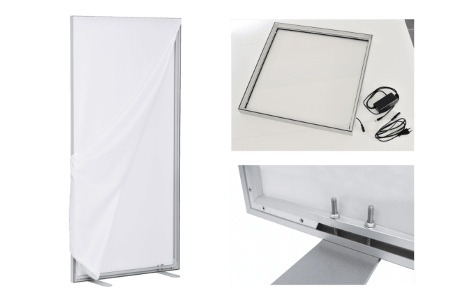 Exklusiva och snygga ramsystem är det perfekta sättet att rikta uppmärksamheten till ditt budskap. LED-belysningen täcker hela baksidan och ger en stark och jämn belysning. Tygvepan monterar eller skiftar man på egen hand utan minsta problem. LED Frames fungerar utmärkt till både högkvalitativa bilder och att förstärka kampanjer, både i skyltfönstret och i din butik. Ramens djup är 35 mm. på enkelsidig och 40 mm. i dubbelsidigt utförande och går att få i flera olika storlekar. Du kan hänga upp din LED Frame på väggen eller beställa fötter till ramen för placering på golvet. Ramen levereras tillsammans med ditt valfria tryck på tyg och med en strömkabel., transformator och stickkontakt.