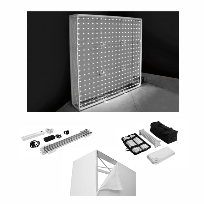 Dra allas blickar till dig på mässan med den snyggaste tygväggen på marknaden, hela ytorna är belysta med en LED gardin för en perfekt jämn ljusspridning på ditt budskap. (Fram + sidor) eller båda sidorna (Fram, Bak + sidor). Ditt budskap trycks på tyg och monteras på ställningen med en silikonlist, enkelt och absolut snyggaste slutresultatet på en perfekt mässvägg (SEG = Silicone Edge Graphics). För extra effekt kan du välja att få din SEG Pop Up-vägg med LED-belysning, se separat produkt