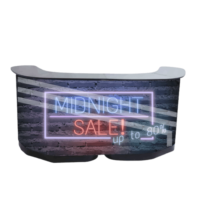 Podiumdisk som tål tuffa tag och som är enkel att transportera med de inbyggda hjulen, transportbox och förvaring i ett. Enkelt montage av bildvåd med hjälp av medföljande kardborrefästen och försedd med fyra stycken hyllplan samt bordsskiva i svart trä. I denna box ryms era rollups/mässväggar för smidig förvaring och transport.