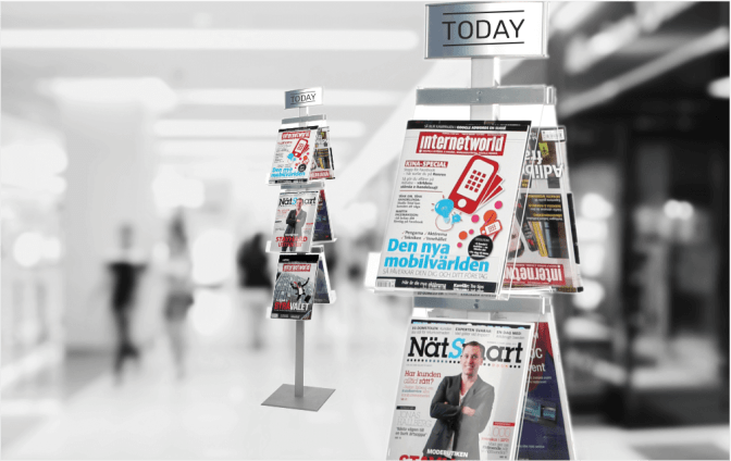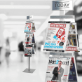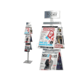 Stabilt och stilrent broschyrställ dubbelsidigt med plats för 6 st A4 broschyrer. Stomme tillverkad av eloxerad aluminium samt broschyrfacken i 3 mm akryl.