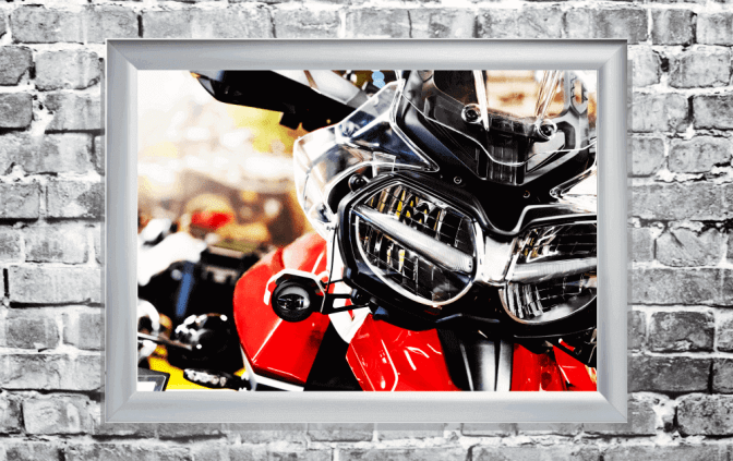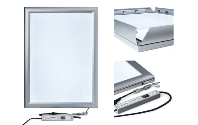 Ljuslåda för utomhusbruk med LED belysning, försedd med snäppramar för enkelt byte av budskap. IP65-klassad och endast 40 mm djup