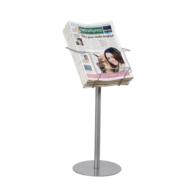 Broschyr- och tidningsställ i metallfärgat material i A4 eller A3 storlek, stativet är enkelt att montera och har en stabil fot.