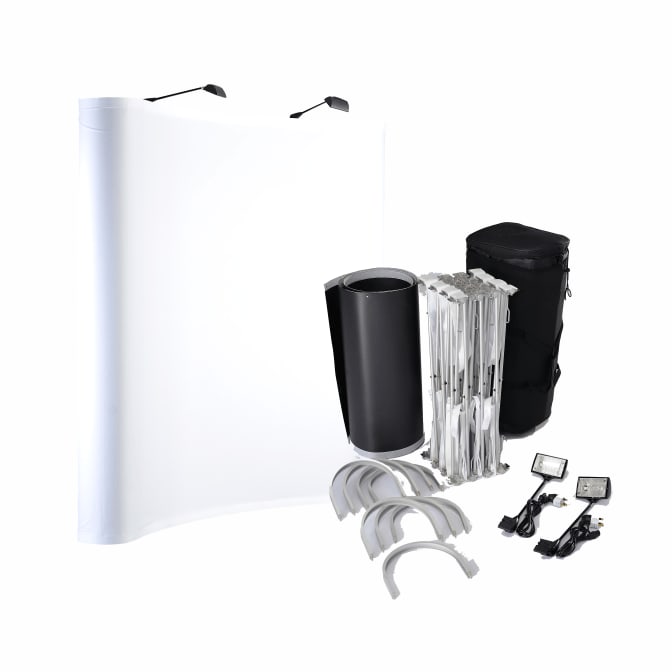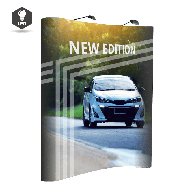 En snygg tygvägg är det effektivaste och snabbaste sättet att fixa en stor och snygg bakgrund på mässan eller eventet. Den här versionen av popup-vägg har en snygg, kurvad design och består av en stadig aluminiumställning som du monterar din vepa med ditt tryck på med hjälp av kardborre. Tygväggen har även två spotlights som ger ditt tryck det där lilla extra. Du får även en snygg och praktisk rullväska för smidig transport av din tygvägg.